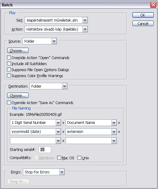 File Naming a File elnevezése. Rogtön az elsõ amit meglátunk egy példa. MyFile.gif, ami azt mutatja hogy a lent beállított adatokból, hogyan állítja össze a File nevet. Mint a képen is látod maximum 5 részbõl állhat a filenév. Én beállítottam, hogy az elsõ része egy sorszám legyen, amit onnan kezd számozni amit ott a Starting Serial-nál állítasz be. Az extension vagyis a kiterjesztés javaslom legyen az utolsó. :)