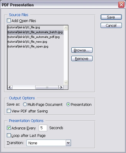 Az Output Options-nál beállíthatod, hogy csak egyszerû többlapos dokumentum(Multi-Page Dokument) legyen vagy bemutató(Presentation), ami átmeneti animációt használ.
