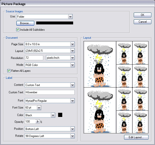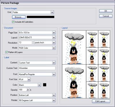 A Source Images-nél beállíthadod, hogy melyik mappa képeibõl állítsa össze ezt a képet. Vagy, hogy az éppen megnyitott képekbõl állítsa össze. Az Include All Subfolers kapcsoló alkalmazza az összes almappára is ezeket az utasításokat.