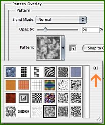 Menjünk vissza a rétegünk stílus lapjára, és adjunk rá még egy effektet: minta átfedés (pattern overlay). Válasszuk a mellékelt képen látható mintát. Ha nem találjátok, nyomjatok a kis nyílra az ablakban, és válasszátok a minta csoportot, aztán ok gomb. Az áttetszőséget állítsuk 20%-ra. Ezzel piszkos hatást adtunk a papírnak, így reálisabb lesz. Persze elhagyhatjátok ha nem kell kosz rá.