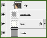 Töltsünk be egy képet amit a fényképre szeretnénk tenni. Jelöljük ki az egészet, másoljuk el, aztán illesszük be a sajátunkba. Tegyük legfelülre a réteget, és nevezzük el képnek. Figyeljünk rá hogy biztosan befedje a papírunkat!
