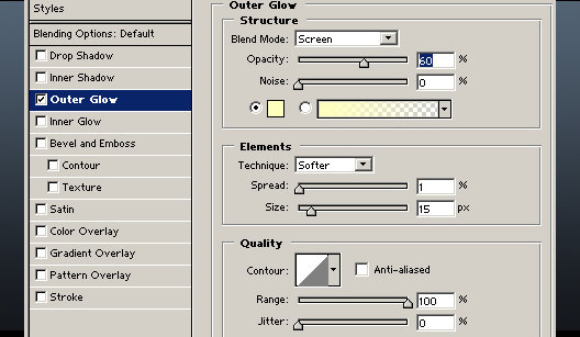 Aztán alkalmazd Layer/Layer Style/Outer Glow [Fóliák/Fólia Stílus/Külső Ragyogás] az alábbi beállításokkal, illetve fűszerezd izlésed szerint.