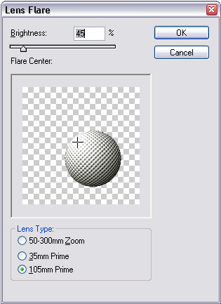 9.) Adunk neki egy kis elegáns fényt: Filter>Render>Lens Flare. A „Lens Type” legyen 105mm Prime és a Brightness 45. A fényt pedig így helyezd el: