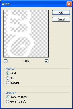 7) Filter->Stylize->Wind…/Filter->Stilizált->Szélfúvás közben meg fogja kérdezni hogy raszterizáljuk-e a képet. Erre nyomjunk OK gombot. :P