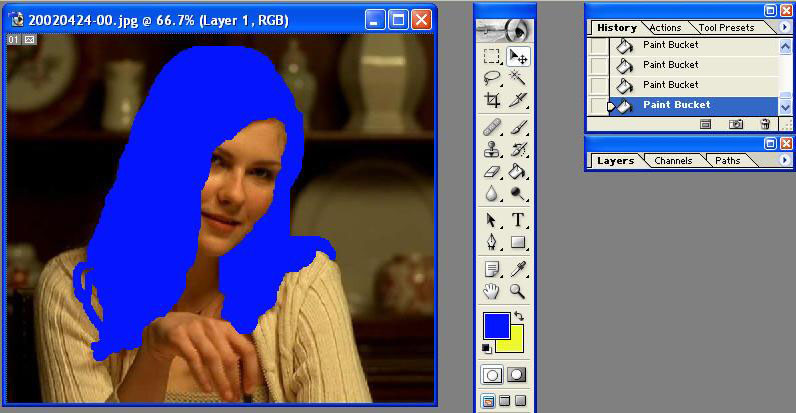 a) Új rétegen a haj területét kijelöljük valamilyen kijelölő eszközzel, mondjuk pennel vagy ecsettel. Ha a kijelölés kész elővesszük a festékesbödönt [gyorsbillentyűje a G] és egy színt borítunk a kijelölt területre.