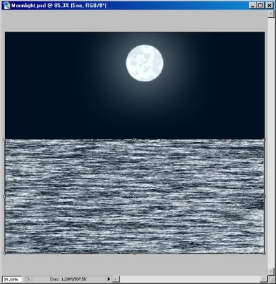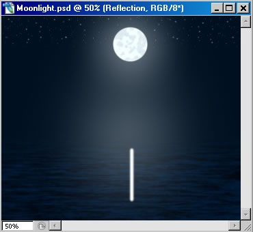 Ismét új Layer. Fehér színű 9-es éltelen ecsettel húzol egy egyenest a holdtól a tenger felszínéig. Majd Edit – Transform – Perspective. Ez arra jó, hogy a képen látható módon széthúzzuk az ecset vonalát.