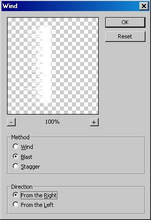 Ezek után, Filter > Stylize > Wind (Blast –al és Left-el ). Majd megismételjük csak right-al.