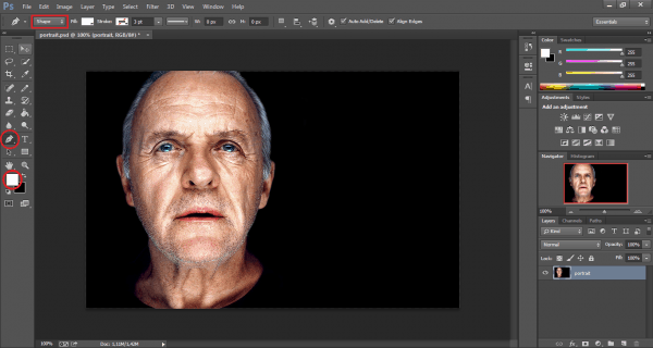 Válaszd ki a Pen Tool-t. A felső menüsorban a Mode legyen Shape-re állítva. Mivel a kép háttere fekete ezért célszerű a Foreground color-t fehérre állítani.