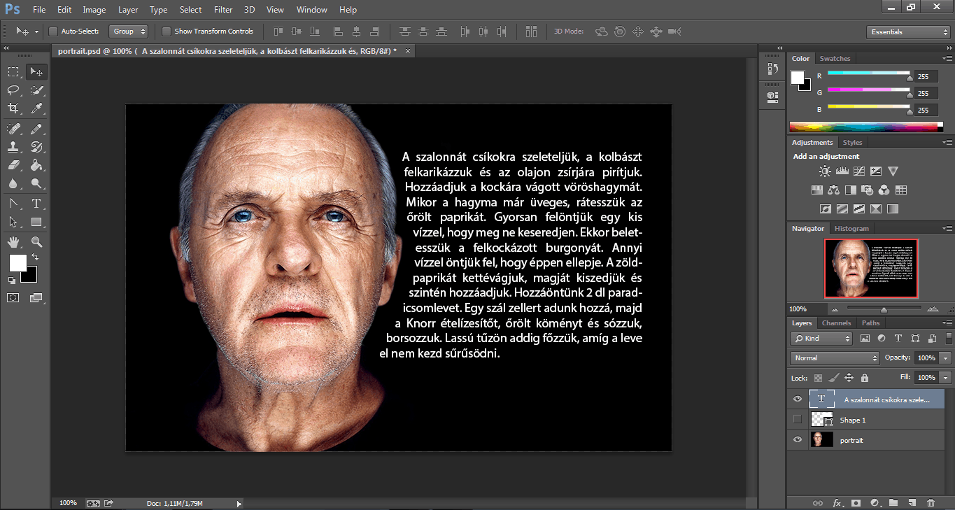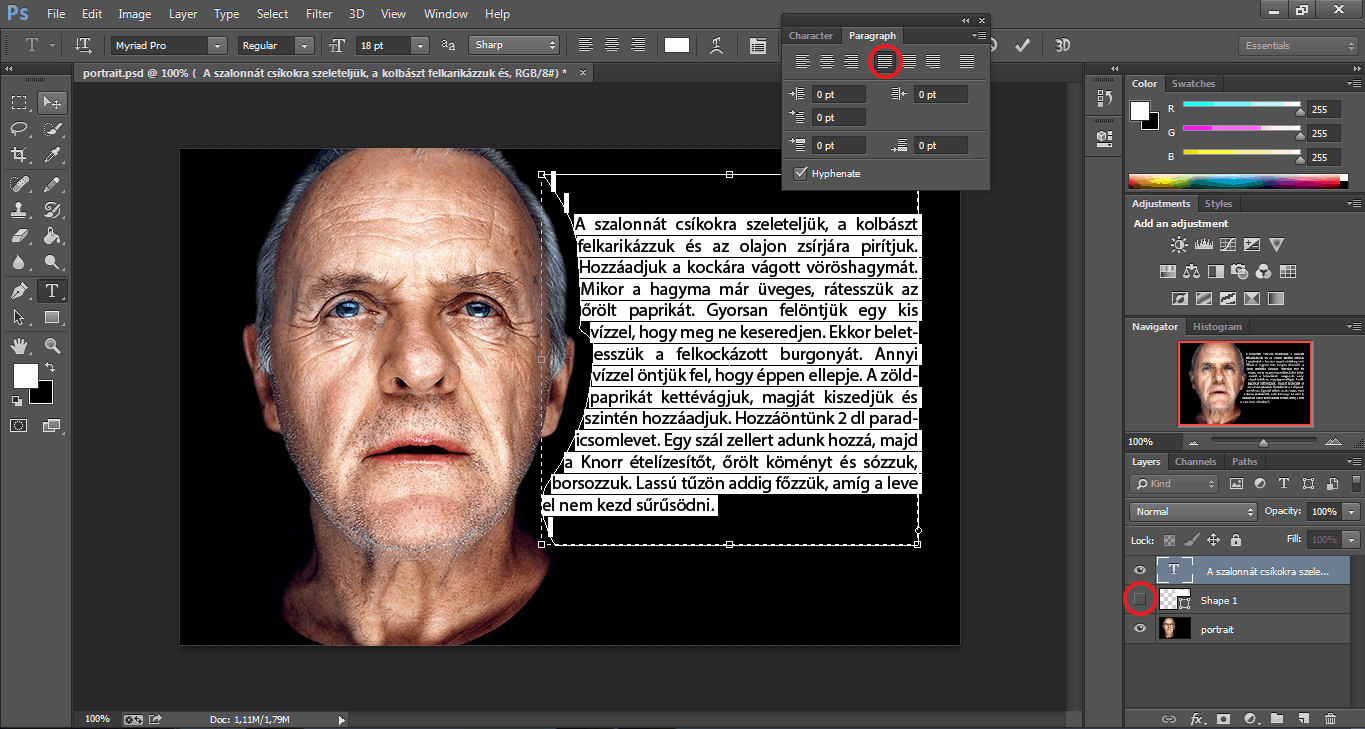Vegyük ki a fehér szövegdoboz Layer elől a szemet és állítsuk be a sorkizárást, betűszínt.