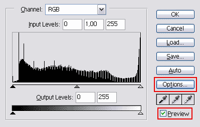 Először is nyissuk meg az előzőleg lementett képet (parnan0.jpg), majd kezdjük talán a színcsatornák helyre-igazításával. Ezt az Image/Adjustment/Levels opciónál tudjuk megtenni [CTRL+L]. A felbukkanó panelen (1.ábra) tudjuk helyrerángatni az egyes színcsatornák hisztogramjait. (Ha a Preview kapcsolót kipipáljuk, akkor a képen azonnal nyomon követhetjük a változtatásokat). Itt lehetőségünk van a kézi beállításra, de legtöbbször a program számításai elegendőek, így kattintsunk az Options gombra.