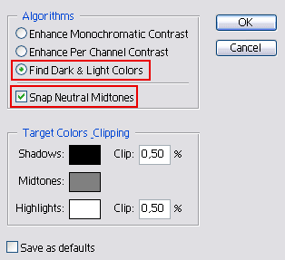 Megjelenik egy új panel (2.ábra), amelyen az Auto Levels algoritmusát és annak paramétereit állíthatjuk be. Jelen esetben én úgy ítéltem meg, hogy a Find Dark & Light colors algoritmus hoz megfelelő eredményt, így ezt választottam + bekapcsoltam hozzá a Snap Neutral Midtones kapcsolót. (A megfelelő opció minden képnél más lehet, függően a képen jelentkező hibától!) Ha itt bekapcsoljuk a Save as defaults kapcsolót, akkor innentől az összes Auto Levels menü/gomb ezeket a beállításokat használja! Nyomjunk OK-t. Ha nem vagyunk megelégedve az automata eredménnyel, még mindig állíthatunk a csatornákon kézzel. Nyomjunk ismét OK-t.