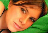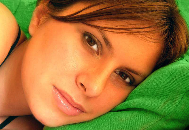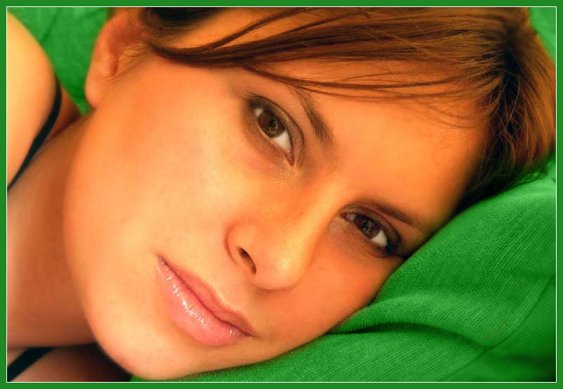 Itt már óvatosan kell festenünk, ha kell, váltsunk kisebb átmérőjű ecsetre. (Persze lehetünk óvatosak eleve a zöldre festésnél, de így legalább megismertük a History panelt és a History Brush toolt;)). Ha ez is megvan, akkor már majdnem kész a „zöldesítés”, viszont mivel a hölgy most egy zöld párnán fekszik, kicsit imitálni kéne a párnáról az arcra vetülő ellenfényt. Ezt az előző zöldre festéshez hasonlóan tudjuk megtenni, de válasszunk egy nagyobb ecsetet, és a festés erősségét vegyük vissza 6-8%-ra! Ehhez nem tudok konkrét receptet adni, ízlés szerint jelenítsük meg az ellenfényt, de ne vigyük túlzásba! Ha mégis elrontottuk, semmi baj, a History Brush Toolal megint visszafesthetjük az eredetit, és a fenti lépéseket addig ismételhetjük amíg megfelelően szép zöld párnát kapunk eredményül, az arcon finoman megjelenő ellenfénnyel (8.ábra).