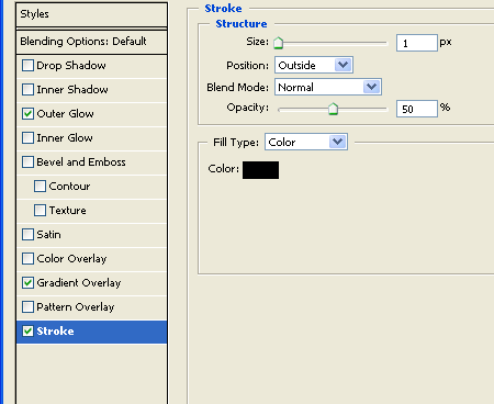 - Csináljunk egy új layert a virágok alatt, itt pedig csináljunk egy, a virágoknál egy kicsivel nagyobb, fehér színű téglalapot. A téglalap layerén jobb gombbal kattintva válasszuk ki a Blending Options almenüt, majd itt a stroke-nél adjunk a téglalapra egy 1px-es fekete színű 30% opacity-val rendelkező körvonalat.