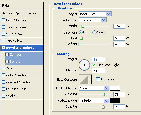 A zene szimbóluma a hangjegy, ezt mindenki tudja. Ötletesnek tartom hogy hangjegyet helyezzünk el a zene ikonunkon. Ehez nincs más teendőnk mint a Custom Shape Tool-lal készíteni egy hangjegyet (a hangjegy a legördülő menüben található, fent), majd a hangjegynek szintén layer style-t adni (pl. drop shadow, bevel and emboss, satin):