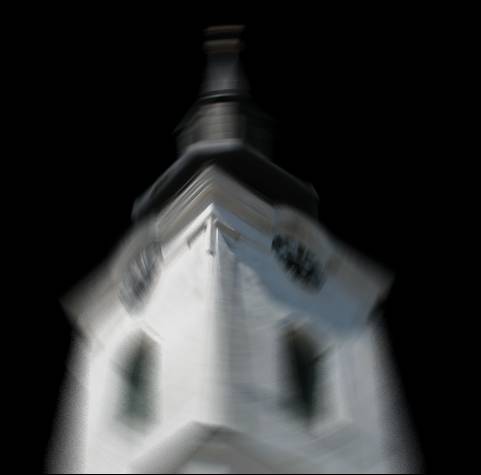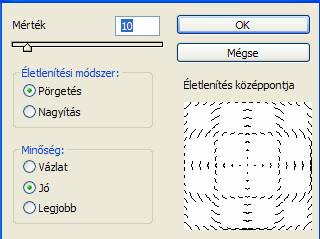 A kép negatívos, és sejtelmes hatásához egy trükköt alkalmazunk, mégpedig a fölső réteget bemozdítjuk (Szűrő -> Életlenítő -> Körkörös bemozdítás. / Filter -> Blur -> Radial Blur.):
