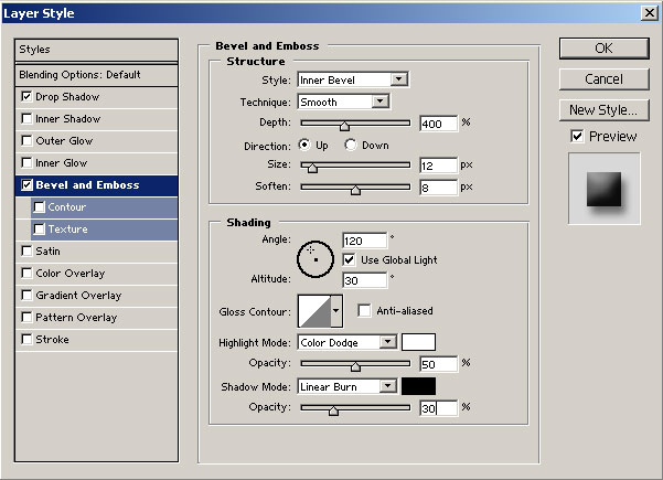 11) A térhatás fokozásának érdekében (mivel eddig nemigazán volt…) a széleit hagyjuk „kibontakozni”… LAYER / LAYER STYLE / BEVEL AND EMBOSS