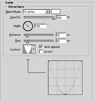 A „layer styles” ablakban keresd meg és válaszd ki a SATIN menüpontot, majd állítsd be a képen látható módon.