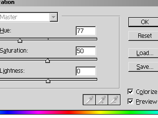 Csinálj egy új layer-t a szöveg-layer fölé, majd nyomd meg a CTRL+SHIFT+E kombinációt, majd alkalmazd a „combine”-t a 2 régetre. Nyisd meg az ADJUSTMENTS>ADJUST>HUE & SATURATION menüpontot, és állítsd be a csúszkákat a fent látható módon. Persze választhatsz ettől eltérő beállításokat is, úgyis látod majd a képen hogy épp milyen eredménye van a módosításoknak. De a fenti képet követed, akkor lentebb látható, hogy milyen eredménye lesz.