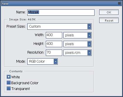 Hozzunk létre egy új lapot, kb. 400×400, 70 bpi, fehér háttér tulajdonságokkal.
