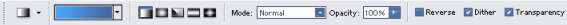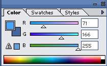 Miután létrejött a lap, kellene valami háttér szerű az üveglapnak. Ezt én kékre állítom. Tehát a [Foreground Color]-nak világos kéket, [Background Color]-nak pedig egy sötétebb árnyalatú kéket válasszunk. Így (világos: #47A6FF, sötét: #46669B):