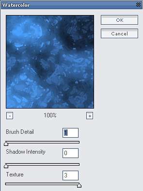 ] gombra, hogy új réteget hozzunk létre. Most menjünk a következő menübe: [Effect/Render/Clounds]. Ezzel egy felhőzetet hoztunk létre, és ha semmit sem változtattál a színeknél, akkor kékes árnyalatú lett. Most jön az „elüvegesítés”. Ezt a következő menüponttal érhetjük el: [Effect/Artistic/Watercolor], és a megjelenő ablakban állítsuk be a következőket: