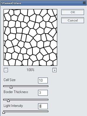 Ha fekete színű rácsot szeretnénk rakni az üvegre, akkor a [Foreground]-nak feketének kell lennie. Most nekünk a [Background] színünk fekete, a másik fehér. Felcseréléshez használjuk a már ismert [X] gombot. Most már létrehozhatjuk a rácsot, a következő menüponttal: [Filter/Texture/Stained Glass]. És beállításnak a következőket válasszuk:
