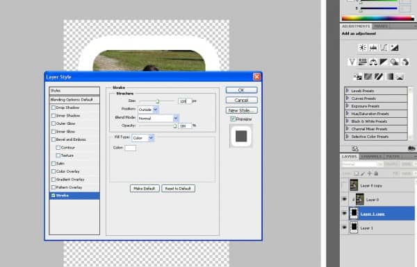 Én 120 pixelre állítottam a méretet ( Size ) és külsőre ( Outside ) a pozíciót. Színnek felvettem a fehéret.