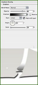 A levelünk szárán olyan effektre van szükség, amitől úgy tűnik a lapból van felhajtva a kivágás. Ezt egyszerű elérni. Menjünk az alak réteg stílus menüjébe, és adjunk neki színármenet átfedést fehérből feketébe. A méretezést húzzuk 20%-ra, aztán a képen nyomva tartva az egér bal gombját (miközben a színátmenet menüben vagyunk), húzzuk azt lefelé, hogy éppen csak a levél legalján látszódjon az átmenet (kép).