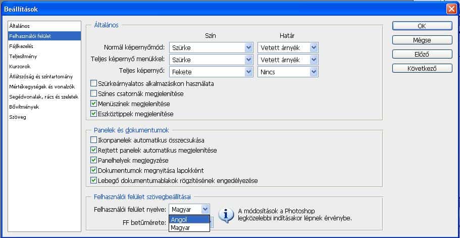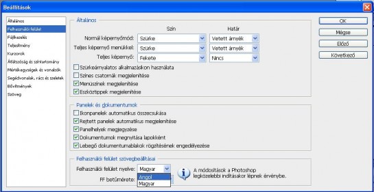 Ezután nyissuk meg a Photoshop-t, ami még magyar, és menjünk a szerkesztés/ beállításokra/felhasználói felület-re,