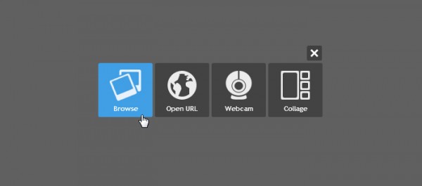 A üdvözlő képernyőn kiválaszthatjuk a fényképünk feltöltésének helyét. Böngészhetünk a meghajtóinkon, url címet nyithatunk meg, de akár a webkamerát is aktiválhatjuk egy fotó erejéig. Friss lehetőség a kollázs készítés, melyhez különböző sablonokat válaszhatunk.