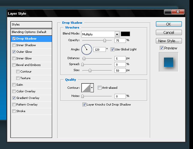 A kijelölt területet töltsd ki egy tetszőleges színnel, nincs jelentősége, hogy milyen… Most a Blending Options-ban megadjuk a Kártyának a stílusát, kinézetét. Tehát a Layer palettán, a Kártya layerre jobb gombbal kattintva válasszuk a Blending Options-t. Majd a felugró ablakban mennyünk a Drop Shadowra, és állítsuk be így:
