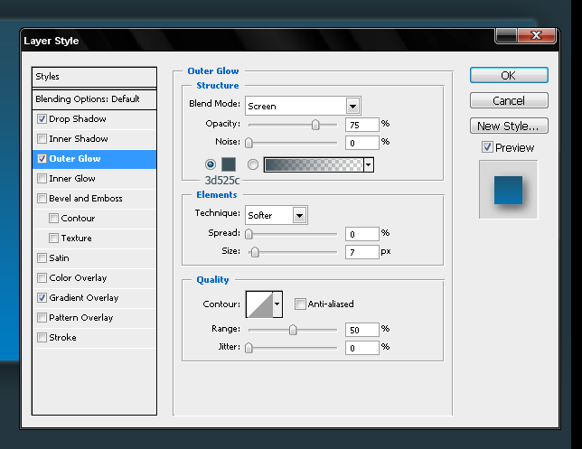 Ezután a keret ragyogását kell elkészíteni, tehát Outer Glow. (Akinek nem tetszik a ragyogás, az enyhén elmosódott íves keret, az használhatja a Stroke-ot is az Outer Glow helyett)