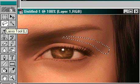 2) A LASSO TOOL segítségével rajzold körbe azt a területet, mely a seb helye lesz. A terület kijelölése után – vagy akár ezt a műveletet már előtte is megteheted – nyiss egy új layert (erre kerül majd a seb). Szóval megvan az új layer, kijelölted a területet, most jöjjön a következő lépés: töltsd ki a kijelölt területet piros színnel (piros, vörös – ahogy neked tetszik). Ne legyen túl világos, ha kell még sötétíts kicsit rajta.
