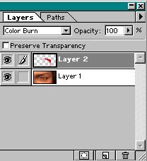 Amint ezzel megvan, piros színű foltot tartalmazó layer tulajdonságait („opacity” a layer palletán) állítsd át COLOR BURN-re.