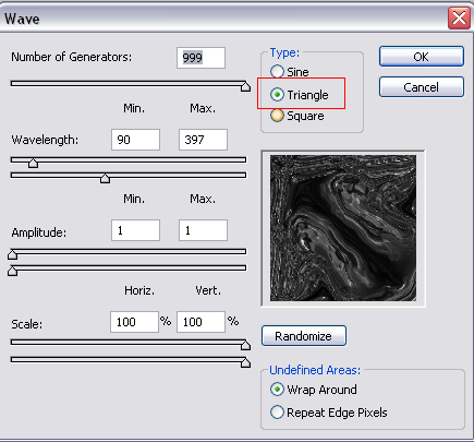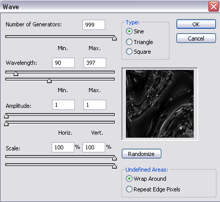 4. Csinálj egy másolatot a layerről (Ctrl + J), Filter >> Distort >>Wave, használd a képen látható beállításokat .