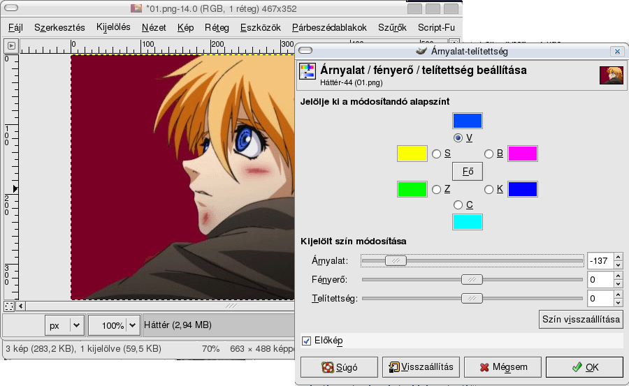 4.) Változtassuk meg a szín összeállítását (Réteg -> Színek -> Árnyalat-telítettség). Jelen esetünkben a Vörös szín nem kell (V)