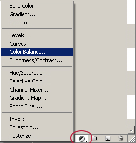 Ha megvan a színezési koncepció, válasszuk ki a Layer -> New Adjustment Layer -> Color Balance (vagy a layer ablak alján található gombon keresztül, a képen látható), majd nyomjunk egy OK-ot.