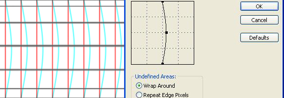 Vízszintes hengerhatás keltése: kijelöljük a kívánt területet, majd Filter>Distort>Shear. Itt a kis „húrt” a közepén megfogva egy-két pixelnyit arrébb toljuk. Undefined areas: Warp around.
