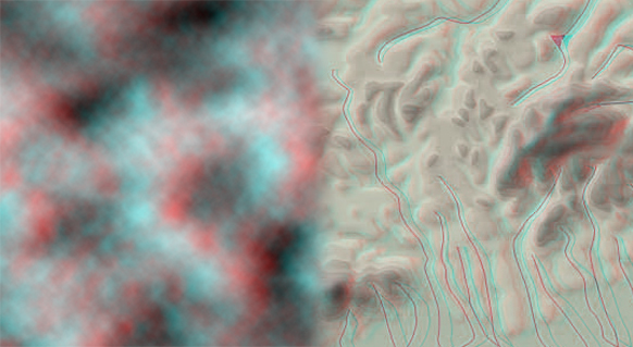 Sztereovizuális térkép készítése: A lényeg itt is a „színtérképen” van. Persze domborzati térkép szükséges hozzá. Minden színt cseréljünk ki, oly módon, hogy a legfelsőbb szintet jelölő szín fekete, a legalsót jelölő szín fehér legyen, a köztes szintek pedig a köztes szürkék. Ezt a legegyszerűbben úgy csinálhatjuk meg, hogy minden szintet kivágunk egy külön layernek, kiszínezzük őket, majd flatten image, és még egy kis blur rá.