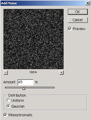3.) Nyissunk egy új layert „CREATE A NEW LAYER”. Most nyomjuk a „D” billentyűnket a színek alap beállításához, majd töltsük fel az újonnan létrehozott layerünket „FEKETÉVEL”. Menjünk a ” FILTER > NOISE > ADD NOISE ” opcióra és használjuk ezeket a beállításokat .Majd kattincsunk az „OK” gombra.