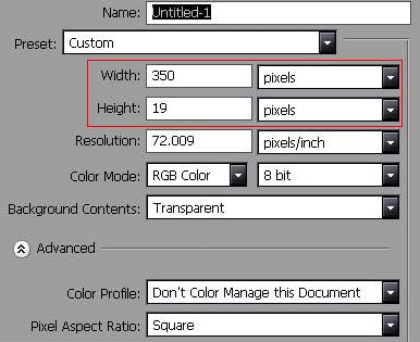 Először is csináljunk egy 350×19 px-es "Transparent" (átlátszó) háttérrel ellátott dukomentumot.