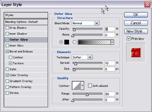5. Színátfedés (piros); Bevésés és domborítás és Felület, végül Külső ragyogás.