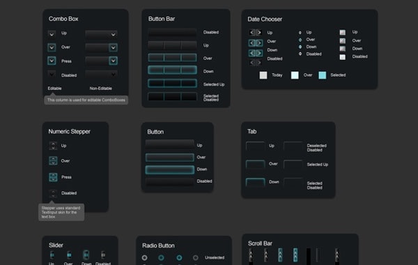 2 színből álló csomag webes felületek tervezéséhez (benne szövegek, táblázatok, tooltip-ek, naptár, gombok, navigációs elemek, lapozás, formok, videó lejátszó, kommentek stb…)