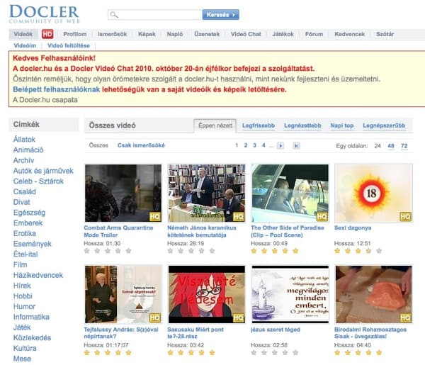 Kedves Felhasználóink! A docler.hu és a Docler Videó Chat 2010. október 20-án éjfélkor befejezi a szolgáltatást. Őszintén reméljük, hogy olyan örömetekre szolgált a docler.hu-t használni, mint nekünk fejleszteni és üzemeltetni. Belépett felhasználóknak lehetőségük van a saját videóik és képeik letöltésére. A Docler.hu csapata