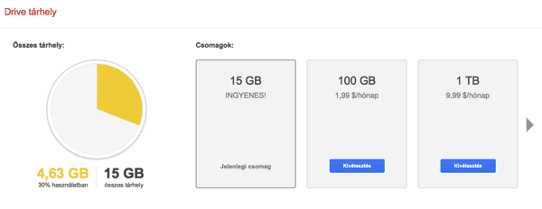 Konkrétan havi 1.99 dollárért (ez most kb 450 Ft) kapunk most 100 GB helyet, havi 9.99 dollárért (kb 2250 Ft) pedig már 1 TB-t lehet venni!