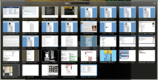 A CTRL+TAB gombokkal lehet váltogatni az egyes ablakokat, gyakorlatilag mintegy slideshow-t, a CTRL+SHIFT+A gombra (vagy F4) pedig az összes megnyitott ablakot megjeleníti mintegy galériaként. Csak kattintani kell a kiválasztott thumbnail-re/tartalomra.