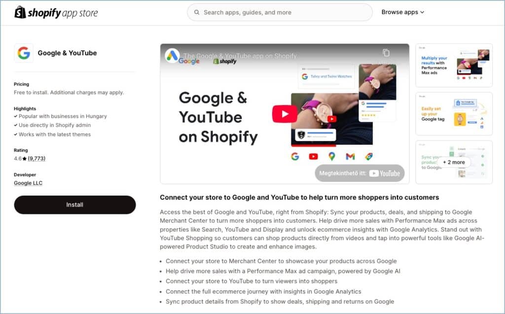 - Telepítsd a Google & YouTube alkalmazást a Shopify App Store-ból