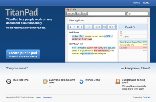 A TitanPad egyébként nem egyedi fejlesztés, Etherpad motor hajtja (amit akár Te is ingyenes letölthetsz és telepíthetsz a szerveredre, ilyen szolgáltatást létrehozva).