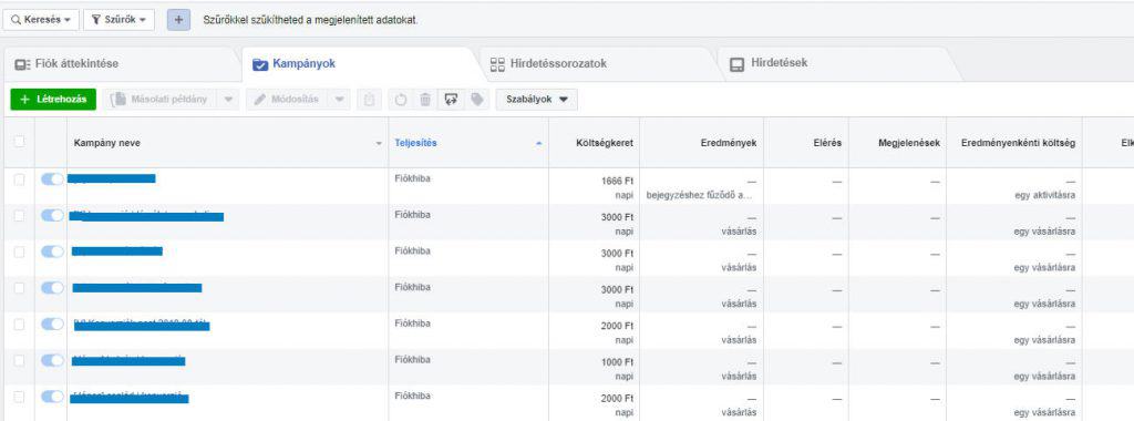 Belépünk a Facebook hirdetési fiókunkba és ez a látvány fogad.