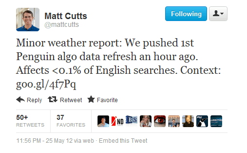 Minor weather report: We pushed 1st Penguin algo data refresh an hour ago. Affects < 0.1% of English searches. Context: goo.gl/4f7Pq — Matt Cutts (@mattcutts) May 26, 2012